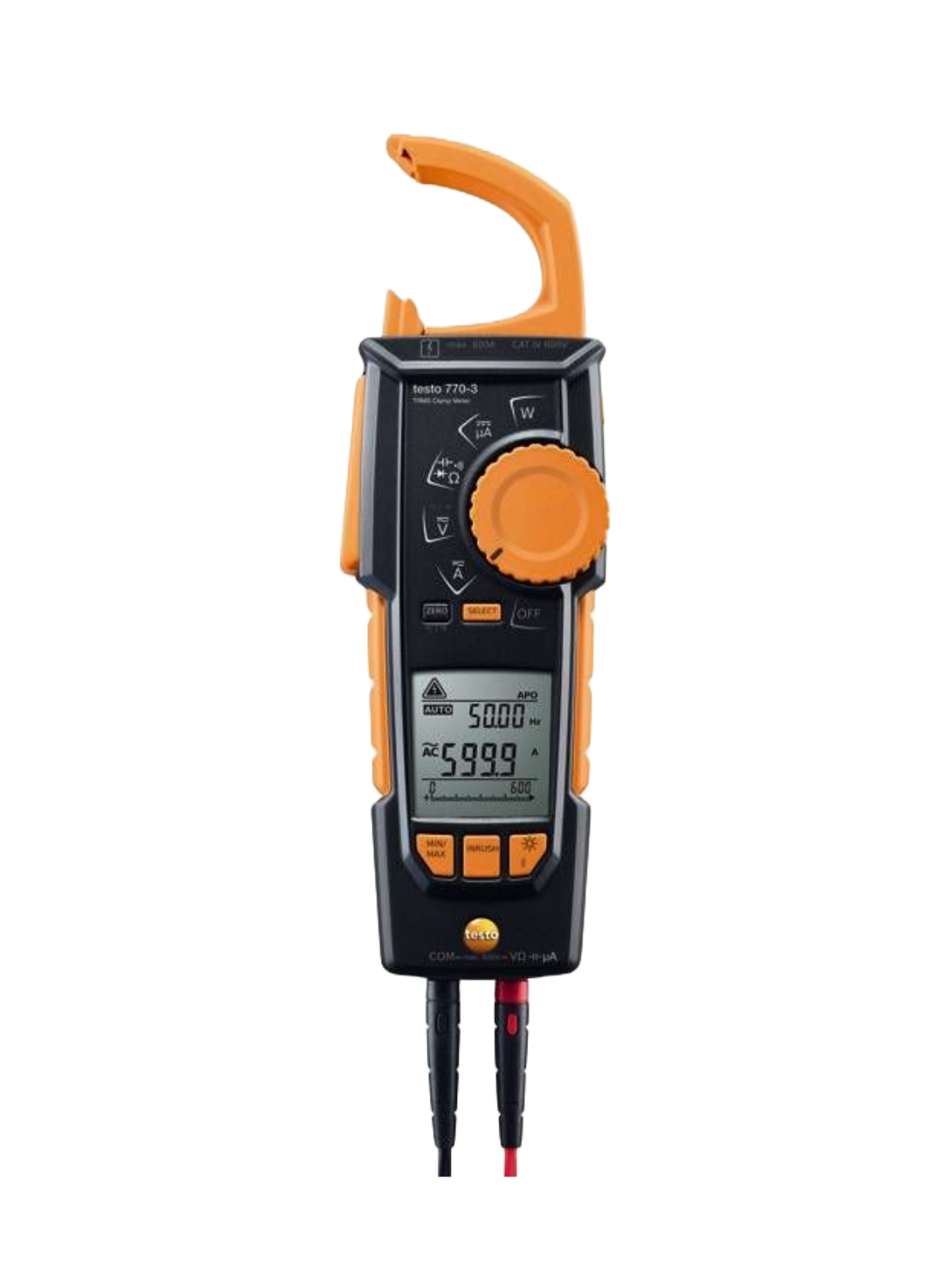 testo 770-3 Stromzange mit Bluetooth, 1 x Satz Messleitungen, Transporttasche, 3 x AAA-Batterien und Prüfprotokoll